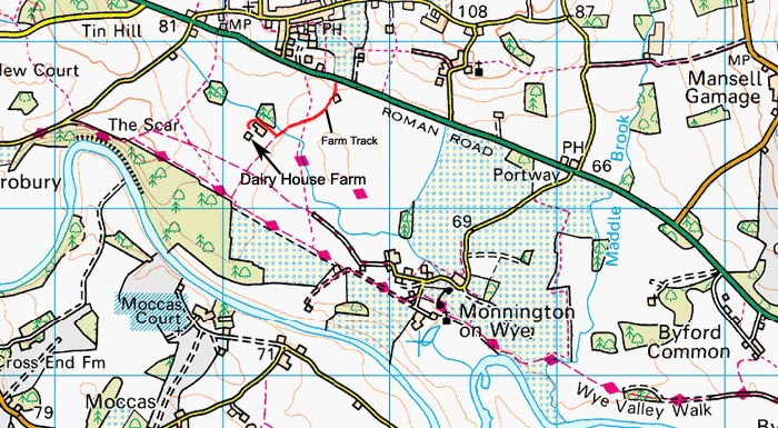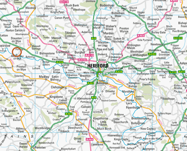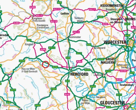 Approximately 8 miles west of Hereford on the A438 Hereford-Brecon road. On passing the Portway Pub, continue for one mile. The entrance is on the lefthand side by a public bridleway sign and farm gate.